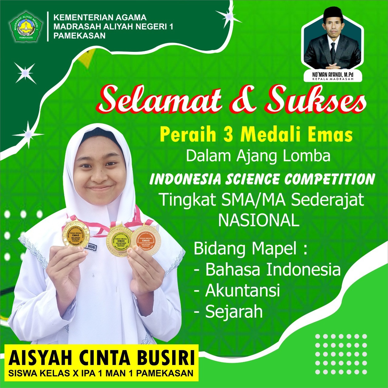 Selamat dan sukses Aisyah Cinta BusiriSiswa kelas X IPA 1 MAN 1 PamekasanPeraih 3 medali emas lomba Baca Selengkapnya...