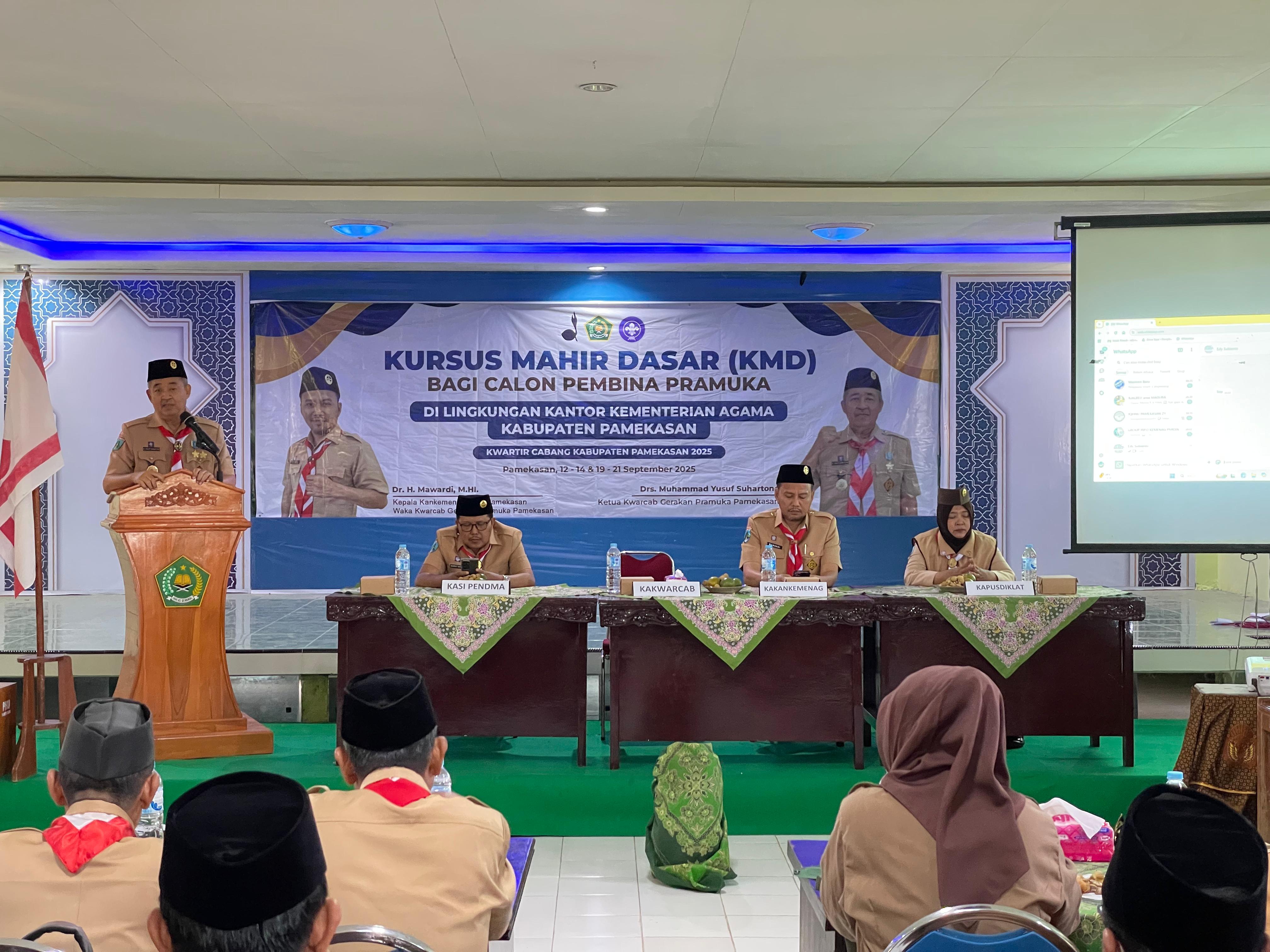 Suasana aula Kantor Kementerian Agama (Kankemenag) Kabupaten Pamekasan tampak semarak, Jumat (12/9/2025). Puluhan peserta dengan seragam pramuka lengkap berkumpul, menandai dimulainya Kursus Mahir Dasar (KMD) bagi calon pembina pramuka yang akan berlangsung hingga 21 September mendatang.
