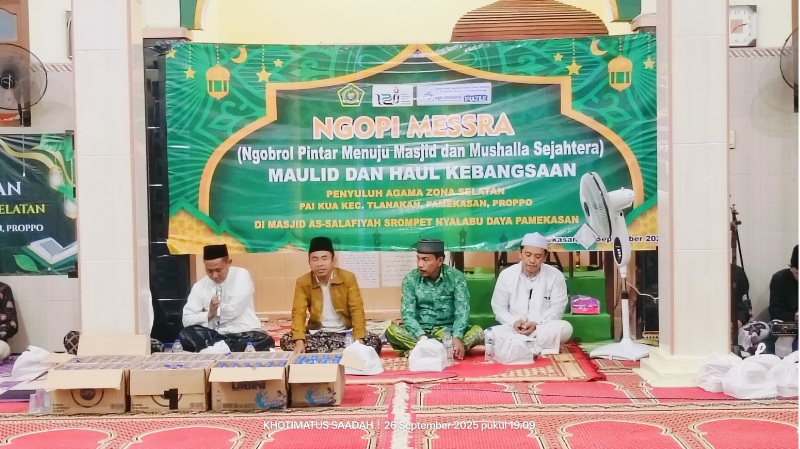 Pamekasan – Penyuluh Agama Zona Selatan atau Puzle menggelar kegiatan Ngopi Messra bersama takmir dan jamaah Masjid As-Salafiyah, Dusun Sompret, Desa Nyalabu Daya, Kecamatan Pamekasan, Jumat (26/9/2025) malam. Kegiatan ini diawali dengan khatmil Quran pada pukul 15.30 WIB, kemudian dilanjutkan dengan Ngopi Messra setelah salat Magrib.